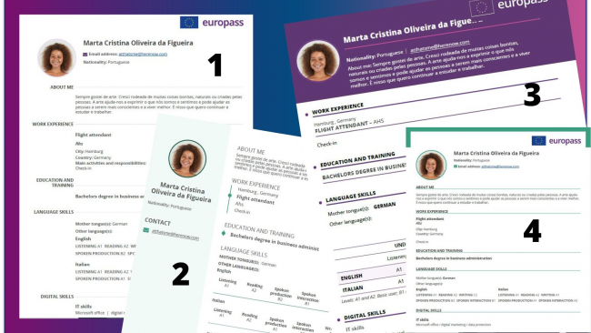 Con Europass è possibile creare il proprio CV scegliendo tra quattro diversi modelli e selezionando il modello con il design che meglio si addice alla propria personalità o più adatto alla proposta di lavoro per cui ci si sta candidando!
